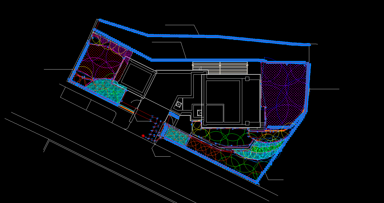 Il terreno del giardino è suddiviso in alcuni terrazzamenti a quota diversa che hanno richiesto un'attenta verifica idraulica. Sono stati utilizzati per le siepi ali gocciolanti da 2 litri/ora e passo di 0,4 metri, per l'erba e gli arbusti pop-up dinamici con gittata da 4,8, a 2,4 metri e pop-up statici da 1,5 metri