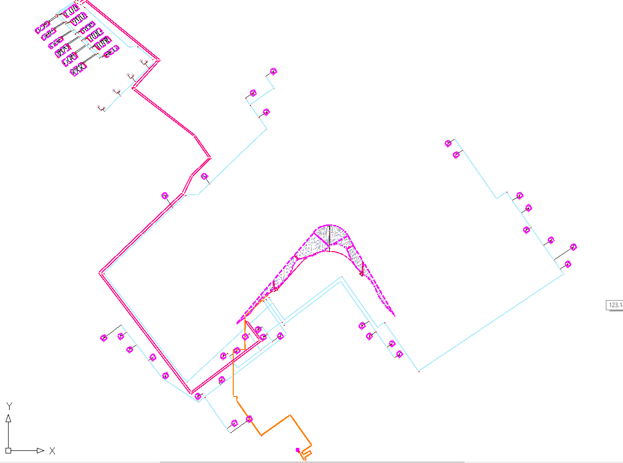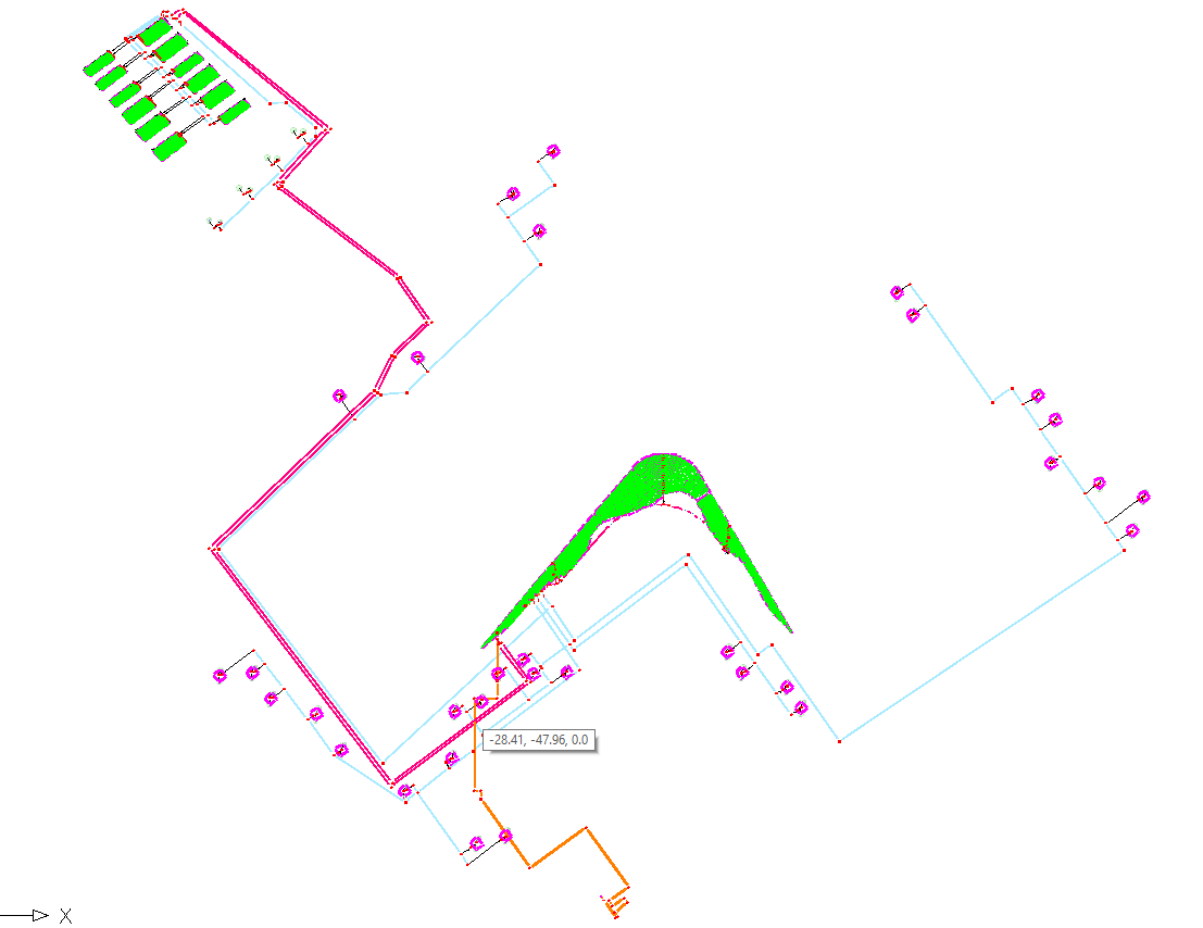Per l'area esterna è previsto un impianto a goccia e a pioggia (con pop-up) alimentato in un unico turno e provvisti di riduttori di pressione a protezione delle parti dell'impianto con pressioni nominali inferiori. E' stato individuato, per la pompa consigliata, il punto di funzionamento e l'accettabilità del rendimento ottenuto. La consulenza ha valutato con attenzione le dimensione e le caratteristiche nominali delle tubazioni per le pressioni e le perdite di carico in gioco. Particolare attenzione è stata posta all'ampia aiuola centrale irrigata con una fitta rete di ali gocciolanti in sub-irrigazione.