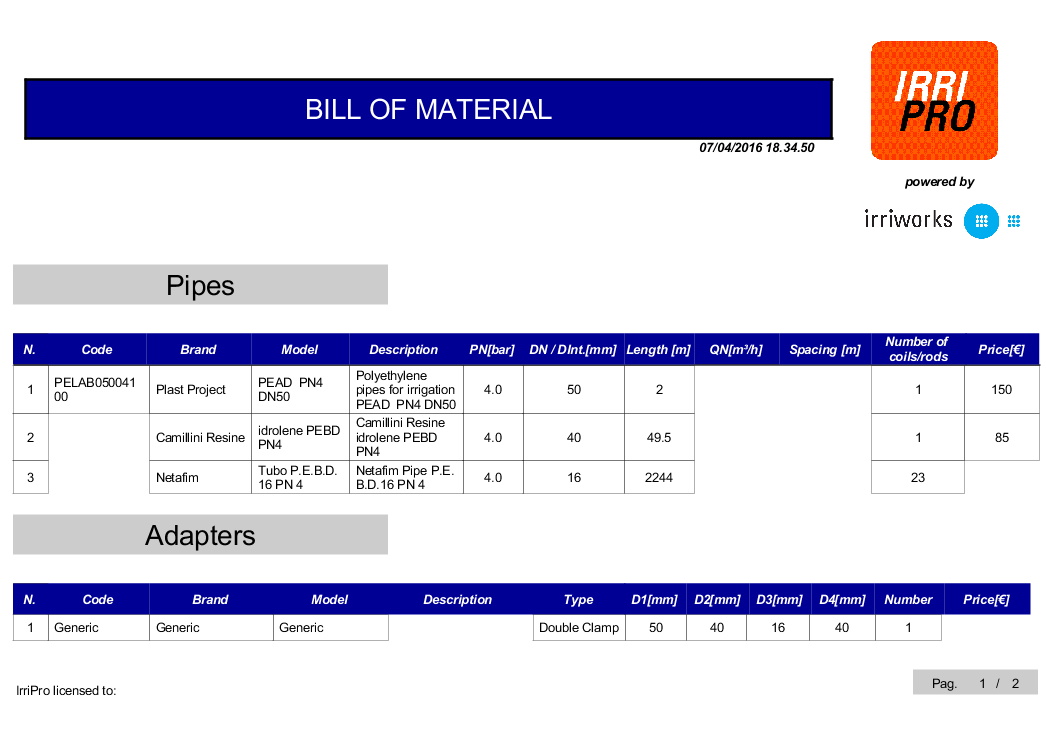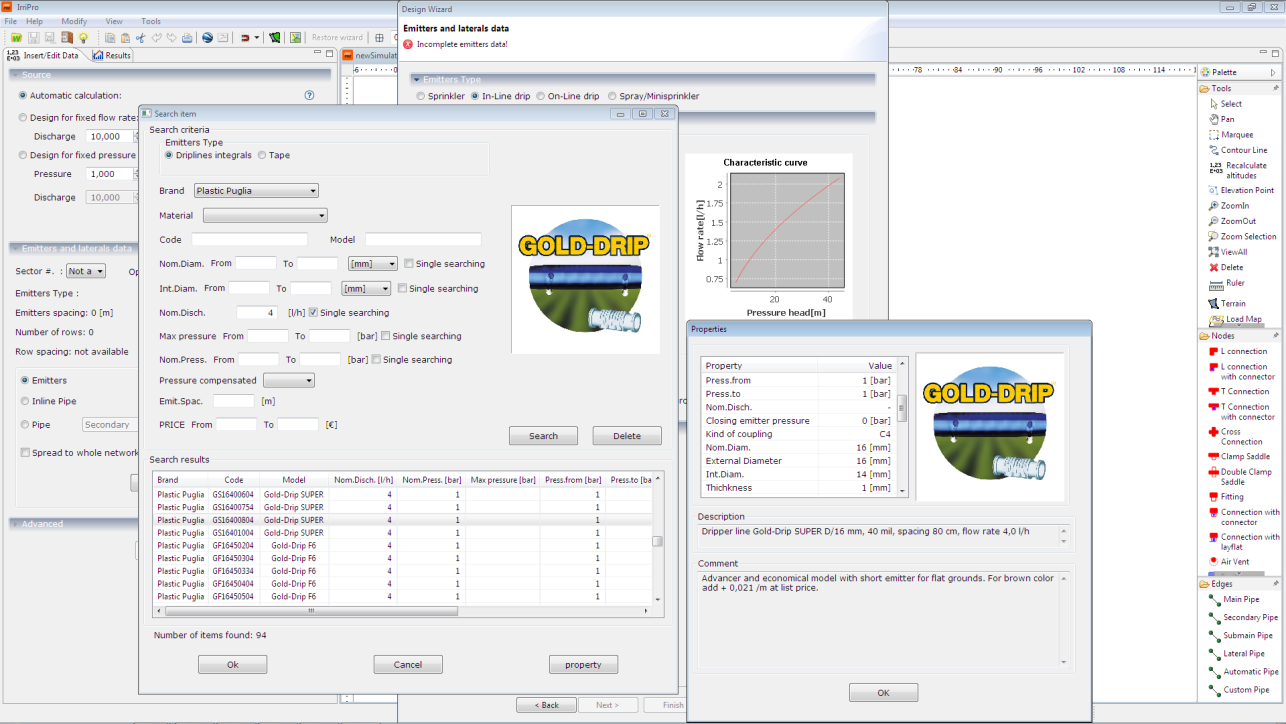Il database di IrriPro viene aggiornato frequentemente anche grazie al continuo contributo di produttori e di partner. Per ogni elemento del database vengono mostrati gli aspetti idraulici, geometrici, prezzi e informazioni tecniche. Se un prodotto non è presente nel database, è possibile inserirlo facilmente con la nuova funzione di importazione.
